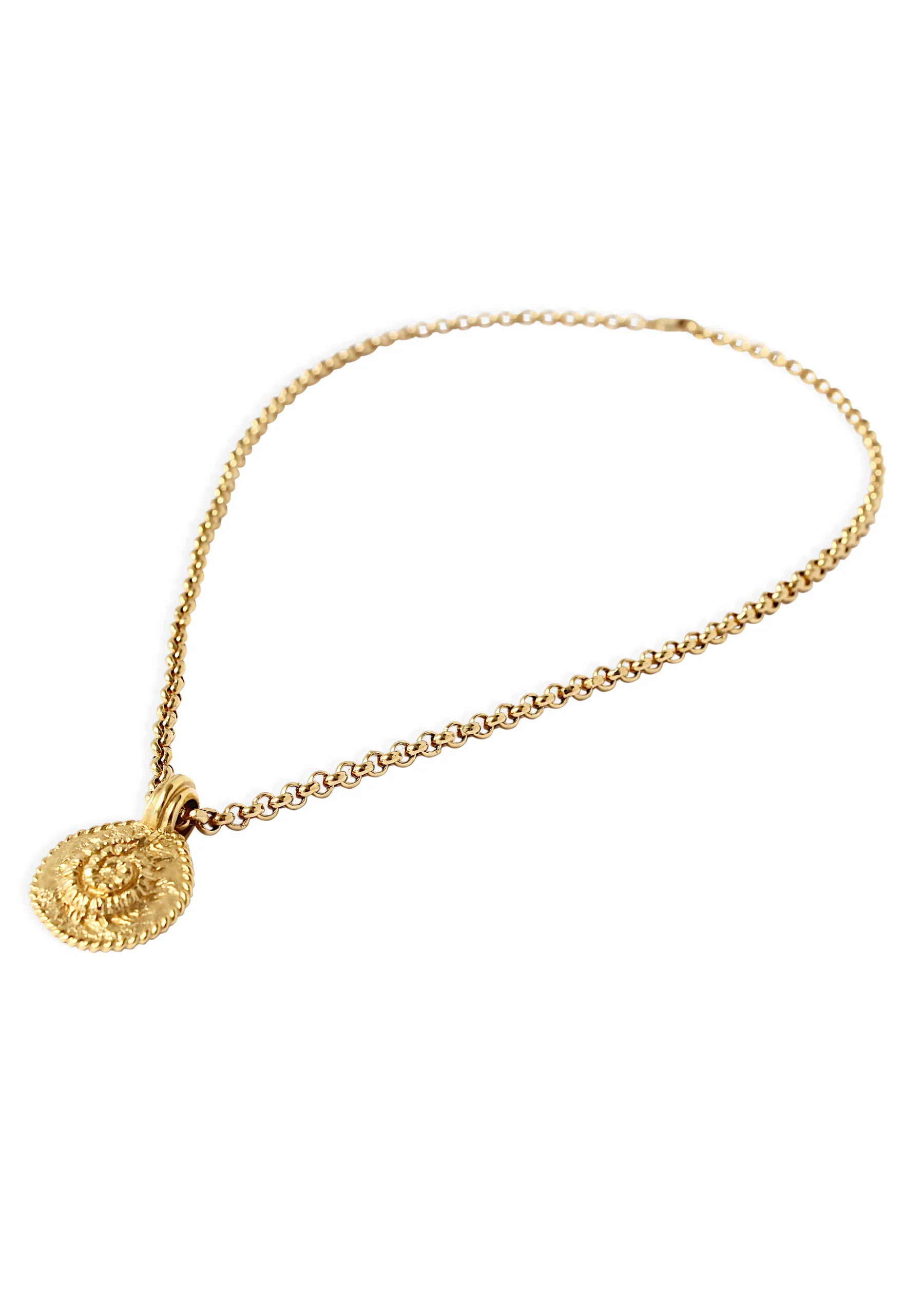 Our 18k gold plated Ammonite necklace is embellished with a hand carved fossil pendant and settled our luxe rolo chain. It is crafted with intricate detail and inspired by nature, making it a timeless piece which you can enjoy forever. Layer with our Aiden necklace which features a matching bail.