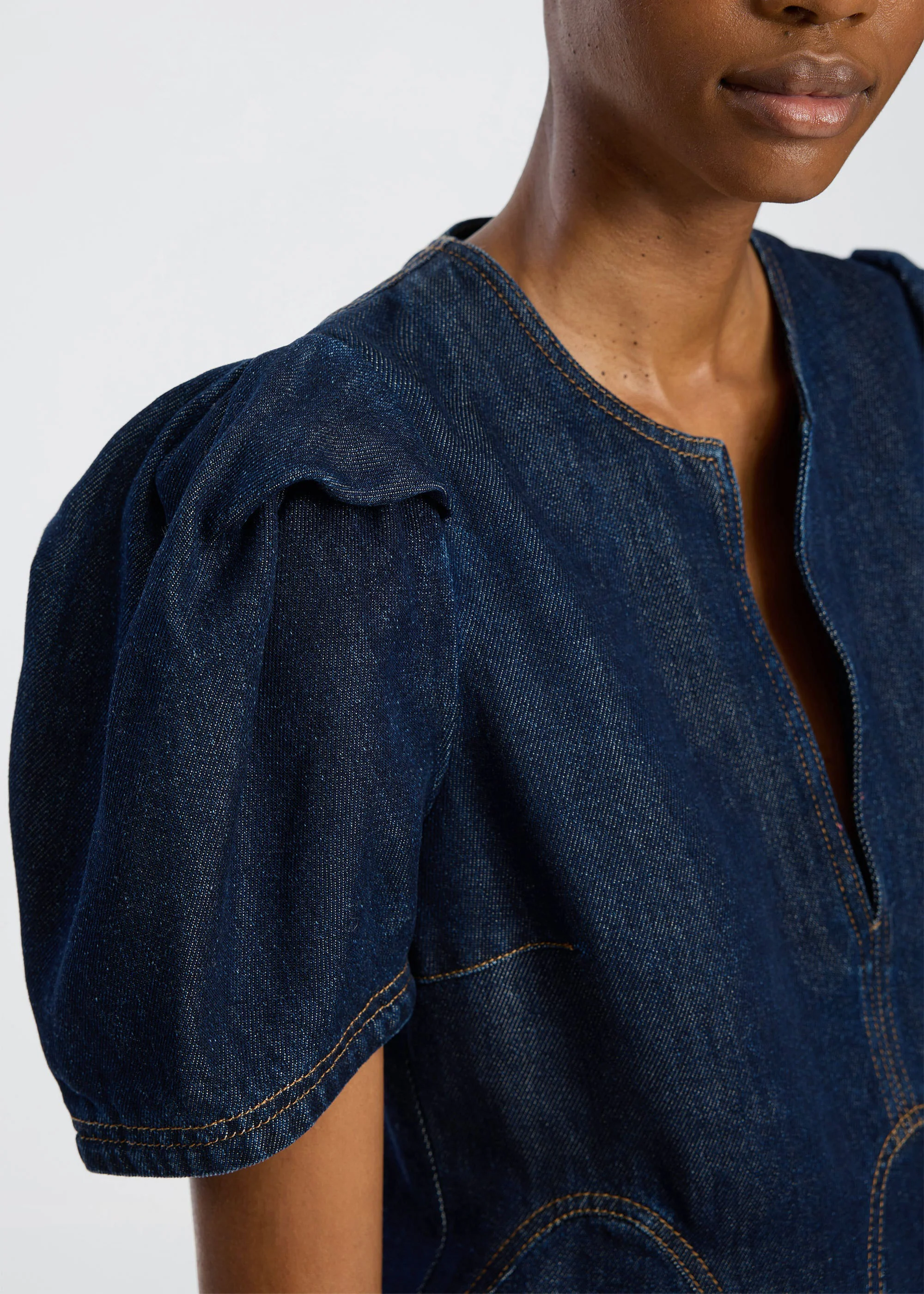 Top with contrast stitching and puffed sleeves. It features a round neckline with a slit, and a gently A-shaped silhouette.