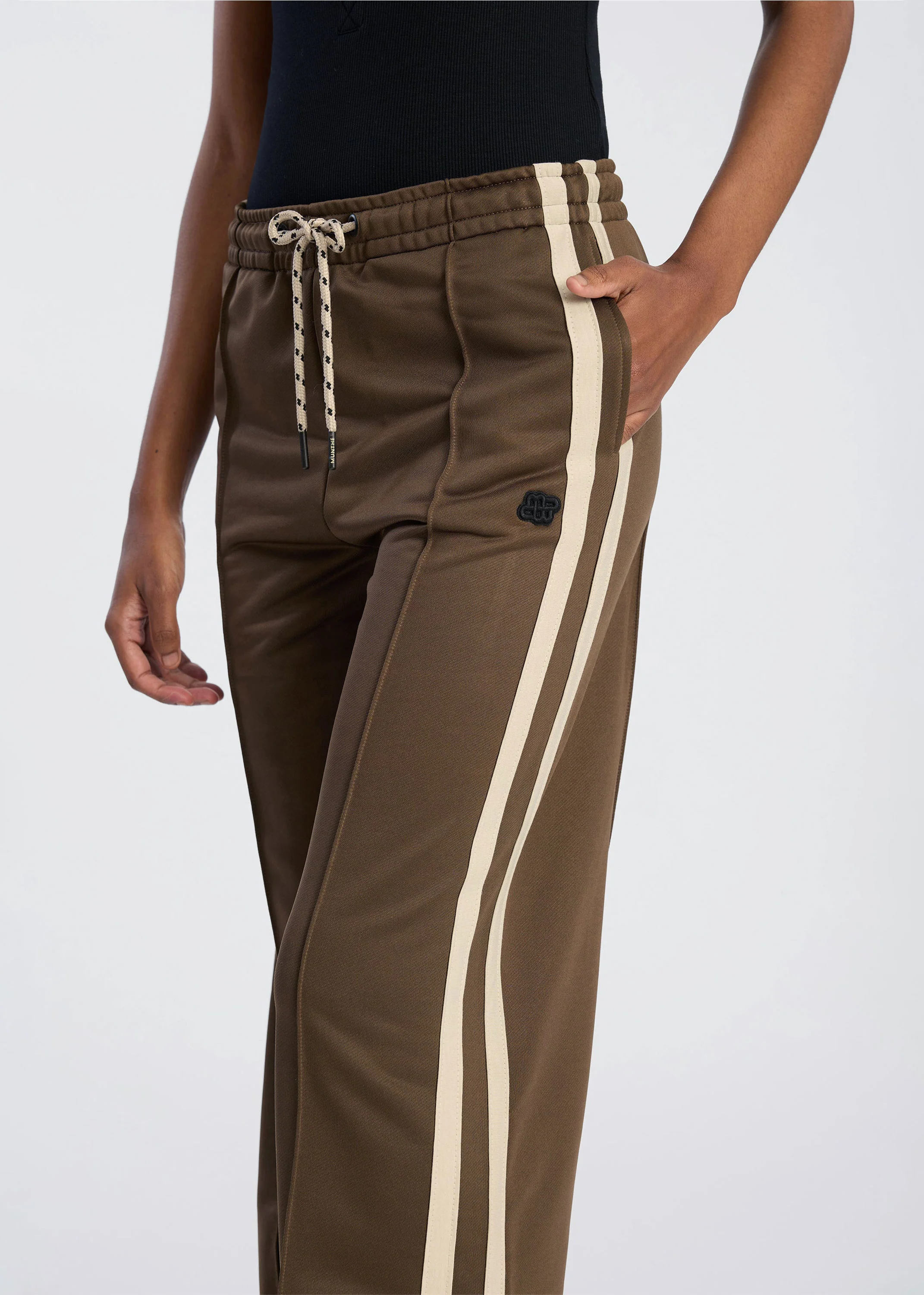 These trousers feature a straight, relaxed fit with an elastic waistband and adjustable drawstring. They are finished with bold side stripes, front creases, and a small embroidered logo. A sporty design suited for everyday wear or more styled looks.