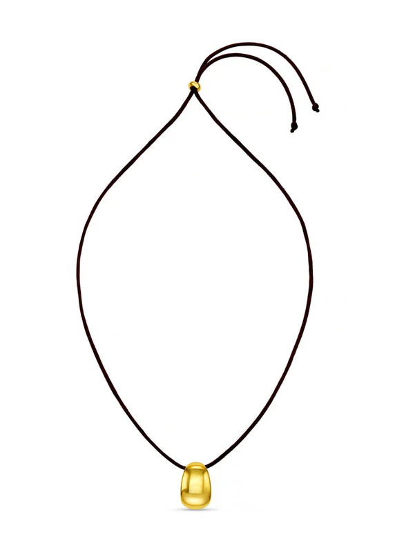 The Gold Tapered Pendant Cord Necklace, features an organic shaped pendant, on a rich brown, adjustable cord. This piece creates an effortless minimalist accessory that elevates everyday outfits.