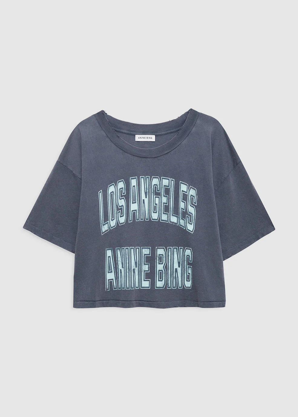 The Johnny Tee is a cropped, relaxed silhouette crafted from soft, lightweight cotton in a heather grey hue, finished with a bold Los Angeles ANINE BING graphic across the front. A classic crew neckline with an effortless, worn-in feel. Style it with denim, tailored trousers, or layered under blazers for off-duty ease with attitude.