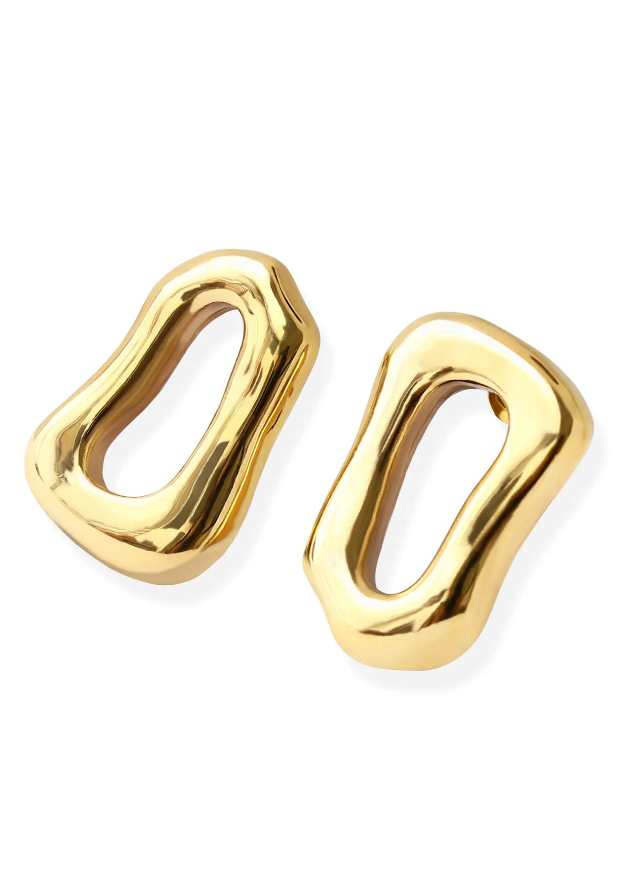 Our Leona earrings have been hand carved out of wax to create this curved irregular shape, then cast in bronze and plated in 18k gold for a luxe finish. They have been hollowed at the back to make them lightweight enough to wear all day.Â