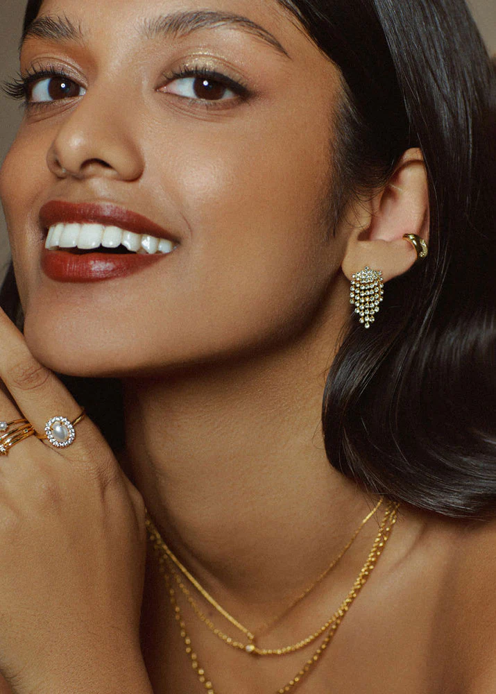 Graceful and shimmering, the Mini Crystal Waterfall Cupchain Earrings showcase cascading crystal chains that move beautifully with every gesture. Small in scale, they add a touch of refined sparkle to any party outfit.