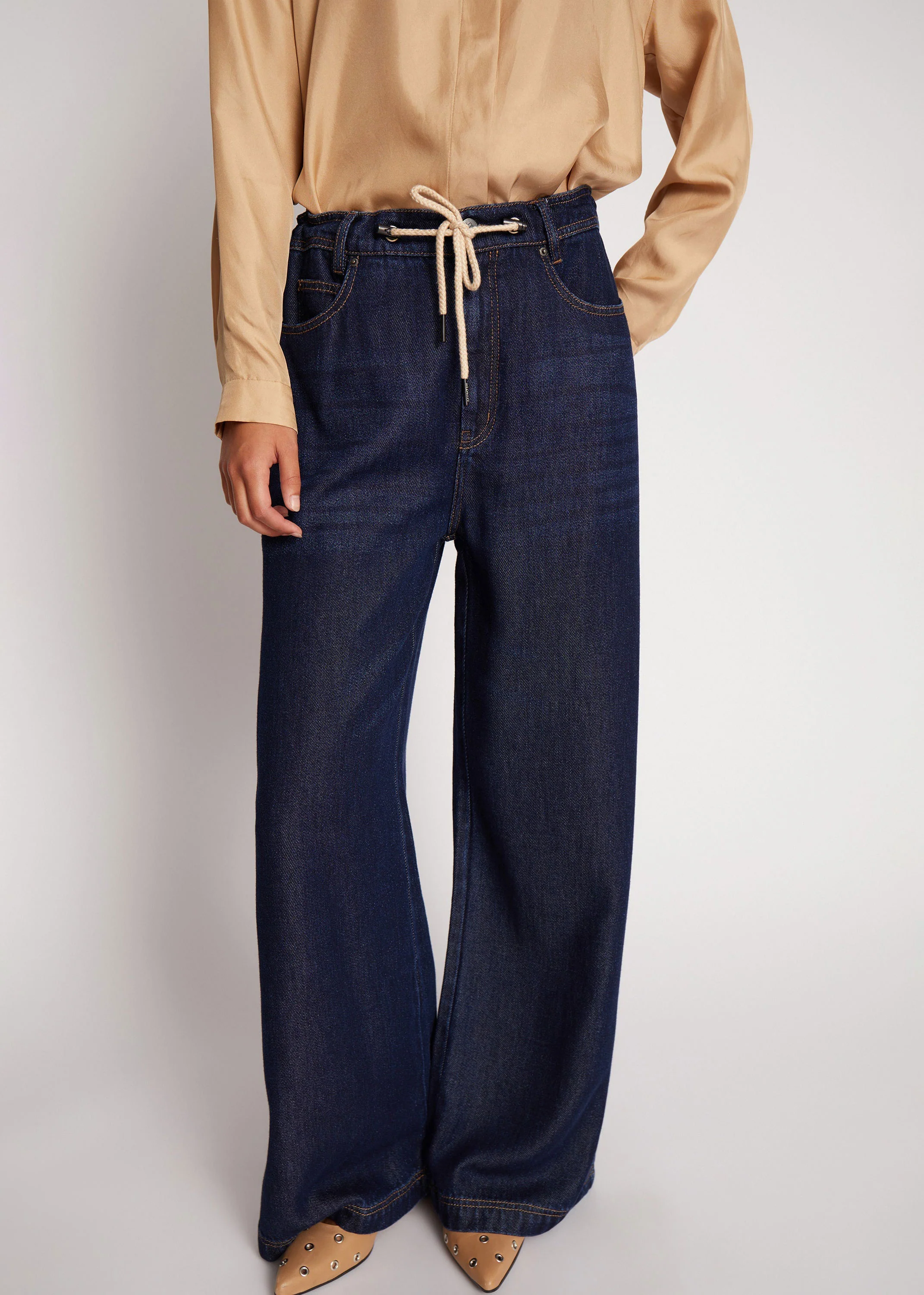 Dark blue jeans, designed with an elegant tie string detail at the waist. These pants have a loose fit, wide legs, and front and back pockets.