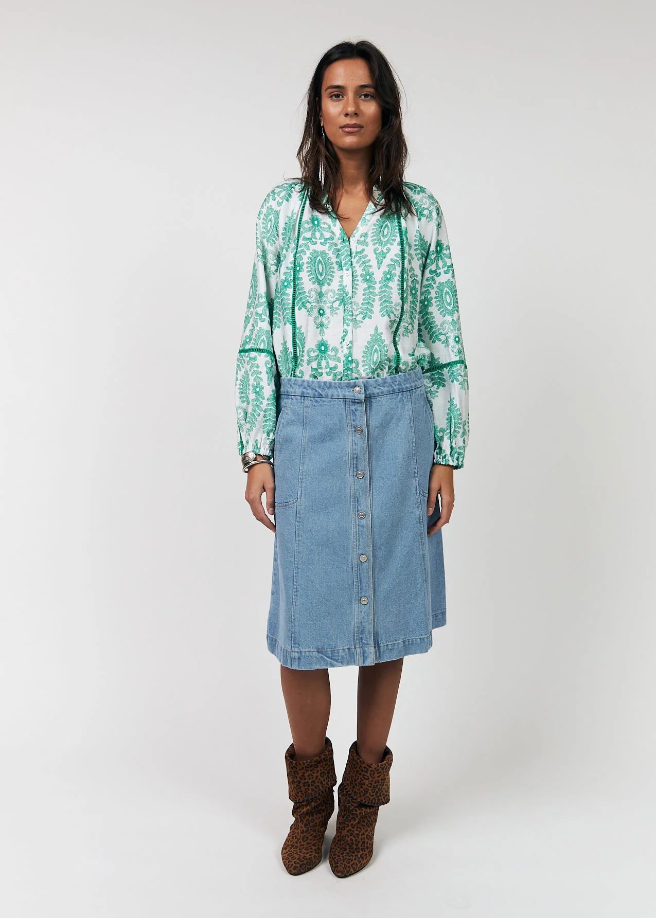 VeroLL is a light and feminine shirt filled with beautiful details. It is made in a soft quality that drapes effortlessly and features a decorative all over print in bright colours.